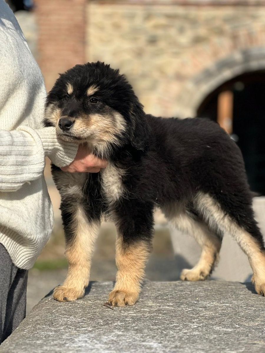 Questa giovane cucciola di Pastore della Sila, di oltre tre mesi, si presenta con un magnifico mantello nero focato, una colorazione affascinante e ricercata che mette in risalto le sue linee armoniose e la sua forte personalità. I diametri sono già ottimi: la sua struttura promette uno sviluppo imponente, ben costruito e tipico della razza, con una morfologia che lascia intuire grande solidità e presenza da adulta.